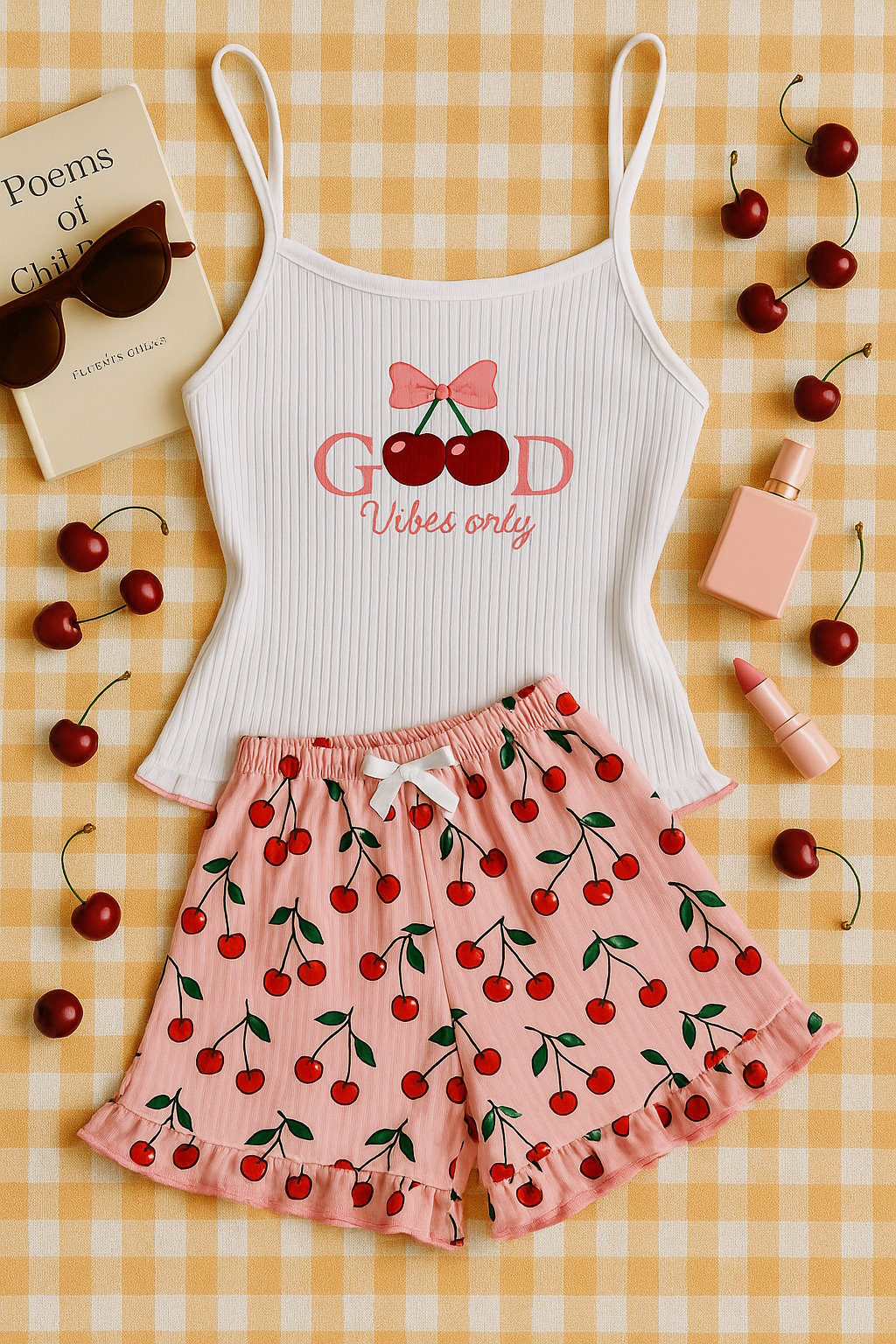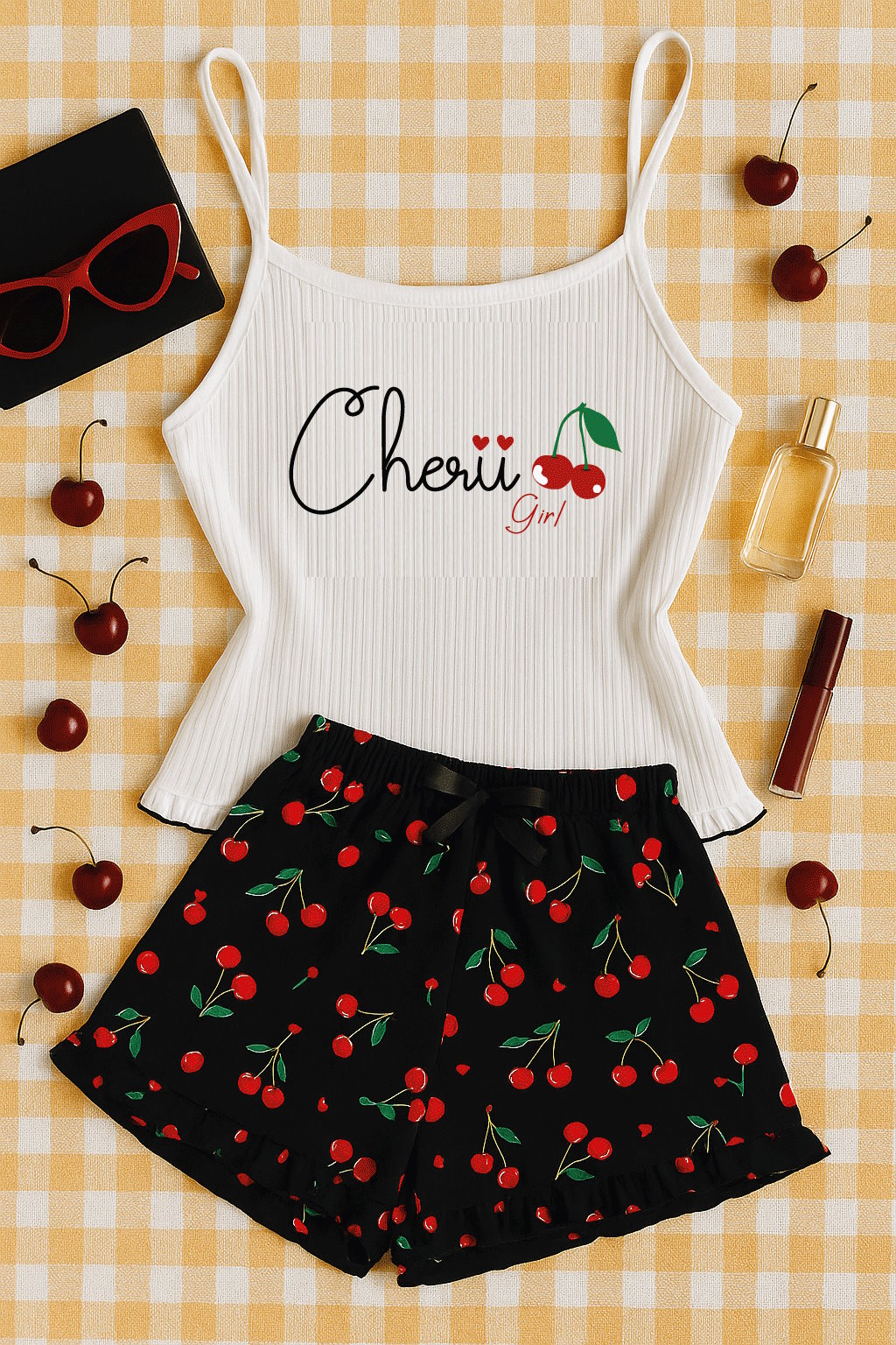 Plongez dans le confort et la fraîcheur estivale avec notre nouveau pyjama "Cherry Edition". Cet ensemble adorable se compose d’un débardeur blanc à bretelles fines orné d’un motif cerise, accompagné d’un short fluide aux imprimés colorés. Parfait pour vos soirées d’été à la maison, il combine style, légèreté et douceur.